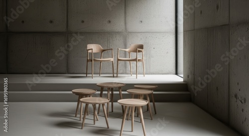 Fototapeta premium Minimalist Wooden Furniture in Modern Concrete Interior