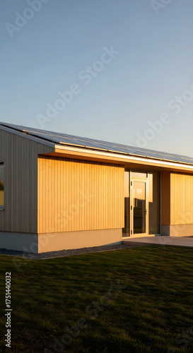 Fototapeta premium Minimalist Wooden House with Solar Roof and Warm Sunset Light
