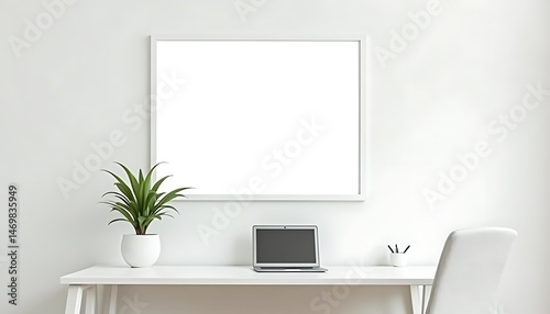© Sanjula, Obraz premium Minimalist workspace featuring a laptop plant and a blank frame against a white wall backdrop