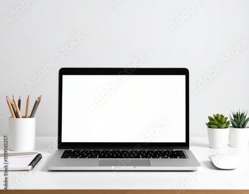 © Nonot, Fototapeta premium Minimalist workspace featuring a laptop with a blank screen succulents and stationery