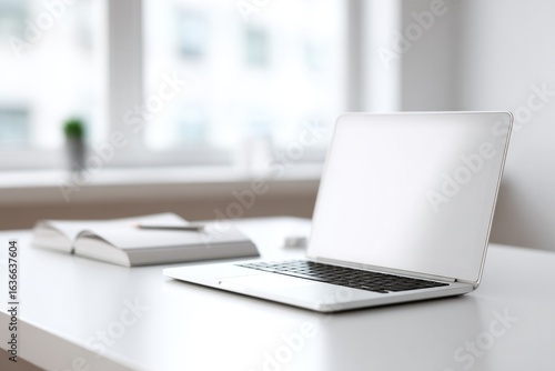 © Maria, Fototapeta premium Minimalist workspace featuring open laptop, notebook, and natura
