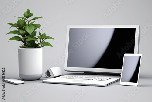 © jerseykamu, Fototapeta premium Minimalist workspace with a laptop, smartphone, and a potted plant.