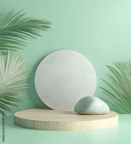 © Gustav, Fototapeta premium Minimalist Zen Product Display, Wooden Podium with Stone and Palm Leaves on a Serene Green Backdrop for Beauty and Wellness Products