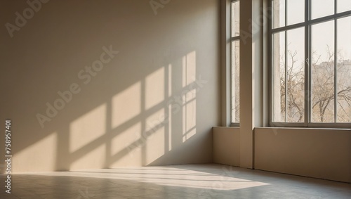 Obraz premium Minimalistic abstract simple gentle light beige background for product presentation with light and beautiful shadow from window on wall