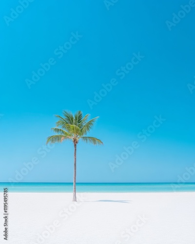 Fototapeta premium Minimalistic Beach Scene with Lone Palm Tree Against Clear Blue Sky and Ocean...