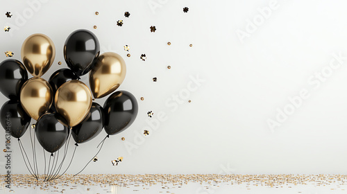 © Duygu, Obraz premium Minimalistic Black and Gold Party Setup with Balloons and Confetti
