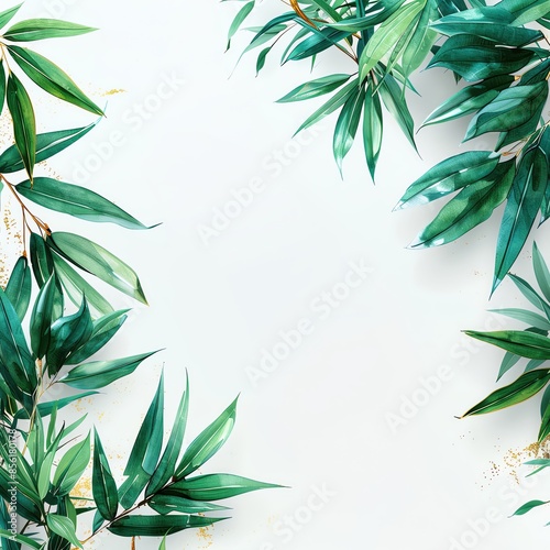 © Nat, Fototapeta premium Minimalistic botanical frame with lush green leaves on a white background, perfect for nature-themed designs and backgrounds.
