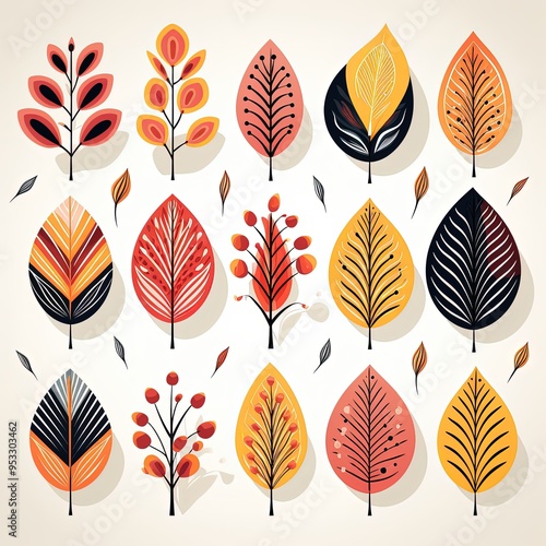 Fototapeta premium Minimalistic Collection of Leaves in Flat Style on White Background