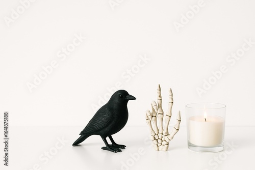Obraz premium minimalistic halloween decor with black crow figurine, skeleton hand, and white candle on plain background