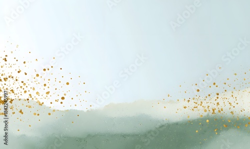 Fototapeta premium Minimalistic horizontal background to match a green and gold color palette, soft white surface with subtle sage green undertones and gentle gold speckles, a calm and elegant