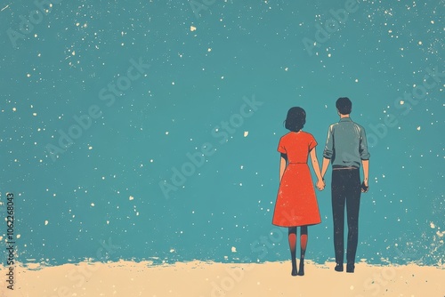 Obraz premium Minimalistic illustration of a young couple holding hands under a starry sky