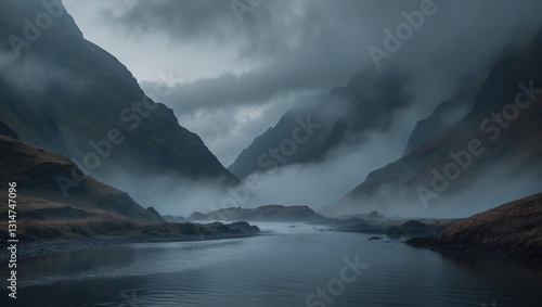 © VirtualVista, Naklejka premium Minimalistic image of a misty valley with mountains and a river.