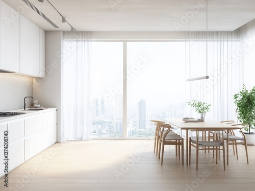Obraz premium Minimalistic interior of a modern apartment with a kitchen and dining table,...