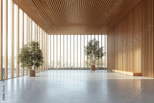 Fototapeta premium Minimalistic interior with wooden slats walls and ceiling, large windows, and...