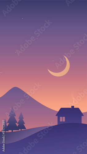Fototapeta premium Minimalistic night landscape with house in Scandinavian style. Gradient...