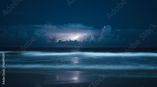 © Taras Vykhopen, Naklejka premium Minimalistic night seascape with a single lightning strike illuminating the dark sky