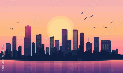 Fototapeta premium Minimalistic Sunrise Cityscape with Reflections and Birds in Flat Vector Illustration