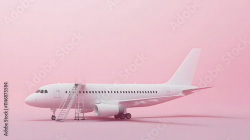 Fototapeta premium Minimalistic White Airplane on Light Blue Background with Boarding Stairs