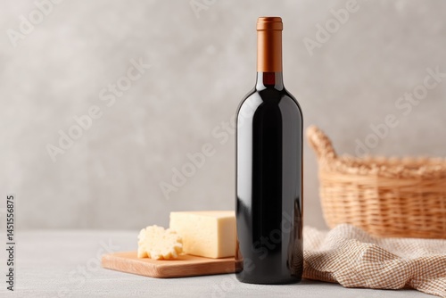 Naklejka premium minimalistic wine bottle standing elegantly next to gourmet cheese plate on...