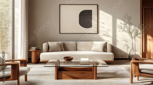 © pinporn manosri, Fototapeta premium Minimalistic wooden frame placed on a glass coffee table, with a sleek, modern living room in the background -