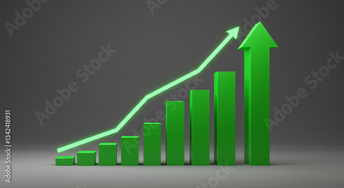 Fototapeta premium Minimalistisches Balkendiagramm mit fetten grünen Aufwärtspfeilen auf einem grauen Farbverlaufshintergrund mit leuchtenden Akzenten, die Erfolg und Wachstum betonen