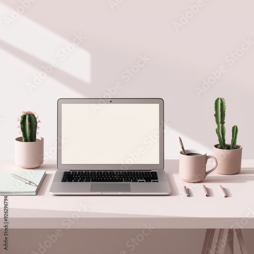 © Samiha, Fototapeta premium minimally designed desk with laptop,coffee,pad,pen and cactus plants