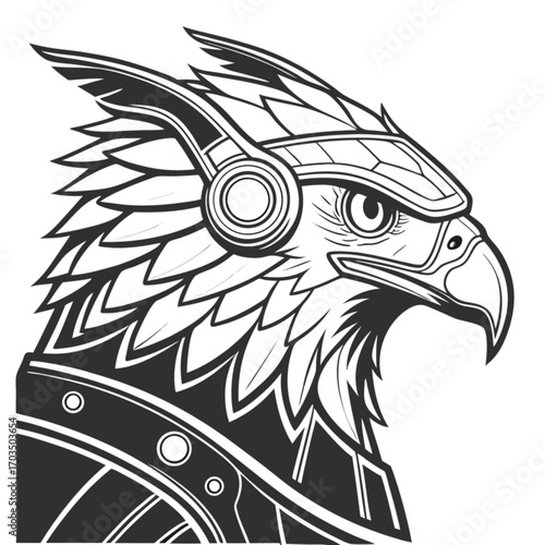Fototapeta premium Minimilist detailed line art illustration of an eagle head with a decorative helmet and shoulder armor design vector