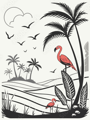 © 1Ten, Naklejka premium Minimilist illustration of flamingos palm trees birds and foliage in a tropical landscape scene in black and white vector