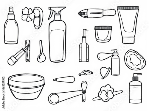 Fototapeta premium Minimilist outline drawing of various beauty and personal care products arranged on a white background surface vector