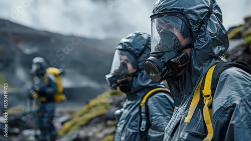 Fototapeta premium Mining Environmental Safety - Workers wearing protective equipment while monitoring environmental safety in a mining site