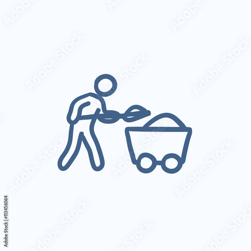 Obraz premium Mining worker with trolley sketch icon.