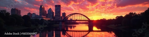 Naklejka premium Minneapolis Stone Arch Bridge sunset silhouette, twilight hues, scenic, Stone...