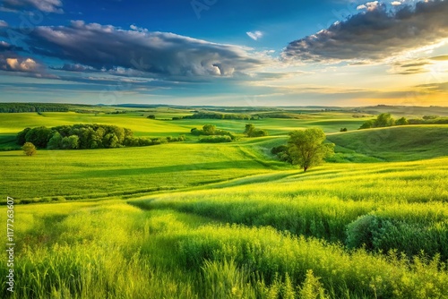 Fototapeta premium Minnesota Prairie: Rolling Green Hills and Grassy Fields - Minimalist...