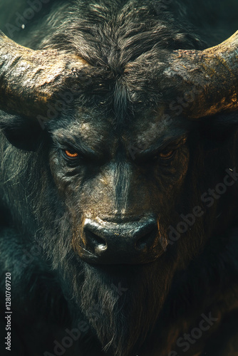 Fototapeta premium Minotaur emerges from shadows with fierce presence in a mythical landscape