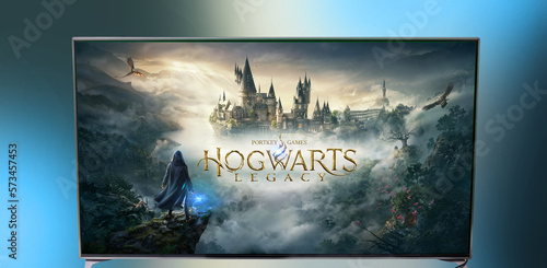 © Elena, Naklejka premium Minsk, Belarus - February 19, 2023: game Hogwarts Legacy on a big TV. Play computer games