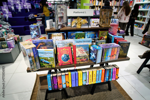 Fototapeta premium Minsk, Belarus. Jan 12, 2025. Decorative book stand with platform 9 3/4 inscription inspired by Harry Potter adventures displayed in bookstore, fantasy literature theme and magical storytelling