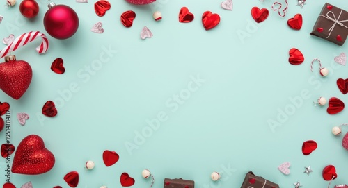 © AkuAku, Obraz premium Mint background decorated with Valentines themed red and chocolate brown ornaments including copy space