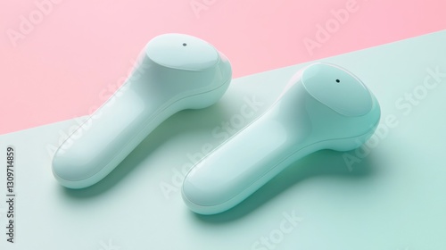 © Nurul, Fototapeta premium Mint-colored wireless earbuds on pastel background