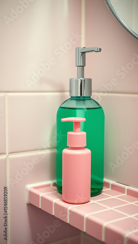 Obraz premium Mint Green Soap Bottle with Pink Dispenser on Pink Tile Bathroom Shelf vertical