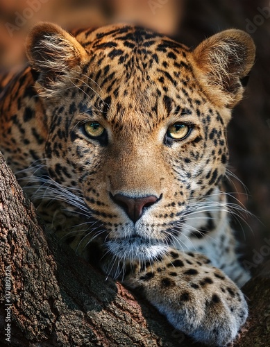 © Argiduna, Fototapeta premium Mirada intensa de un leopardo posando en un árbol – Imagen de alta calidad