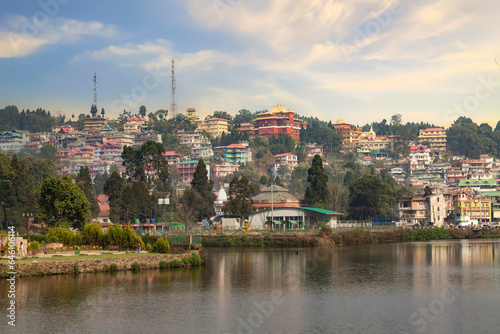 Naklejka premium Mirik lake with its cityscape at sunset. Mirik is a popular tourist...