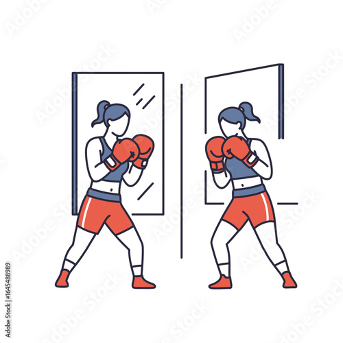 © Shahid, Fototapeta premium Mirror Boxing Silhouette: A determined individual practices boxing, shown in silhouette, with a reflection in the mirror, symbolizing self-improvement, strength, and perseverance.