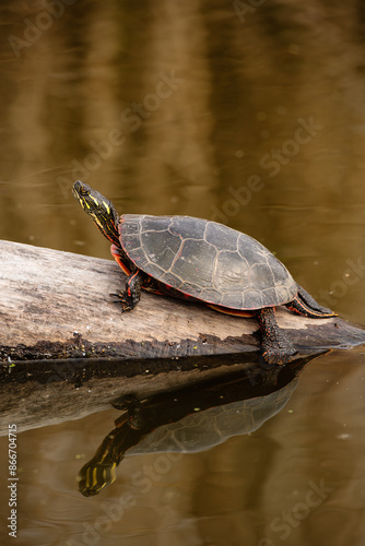 Obraz premium Mirror-image single turtle, basking in late autumn sunshine, in Horicon...