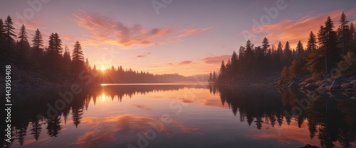 Fototapeta premium Mirror-like lake reflects a breathtaking sunset's glow , clouds,...