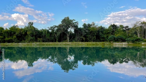 © Lisi4ka, Fototapeta premium Mirror reflection of the landscape shore in the reservoir.