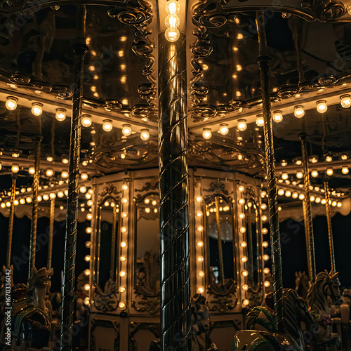 © Ahsan, Obraz premium Mirrored Carousel with Soft Glow of Bulbs