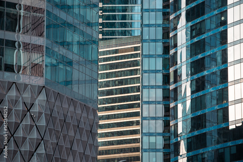 © Sofiia, Fototapeta premium mirrored windows of the facade of an office building with blue panels