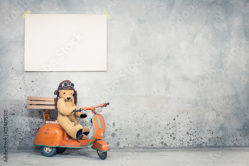 © BrAt82, Naklejka premium Miś w kasku pilota skórzanego siedzi na skuter stary zabawka retro pomarańczowy z pudełek pizzy w przedniej betonowej ścianie teksturowanej tle z dużym pustym plakacie papieru. Filtrowane zdjęcie w stylu vintage