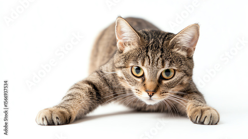 © BURINKUL, Obraz premium Mischievous cat stretching front legs forward, sneaky expression, white backdrop