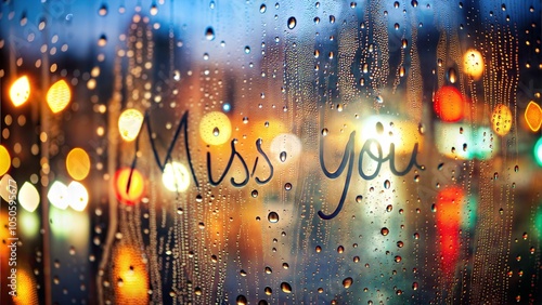 Obraz premium "Miss You" Message on Rain-Covered Window with City Lights